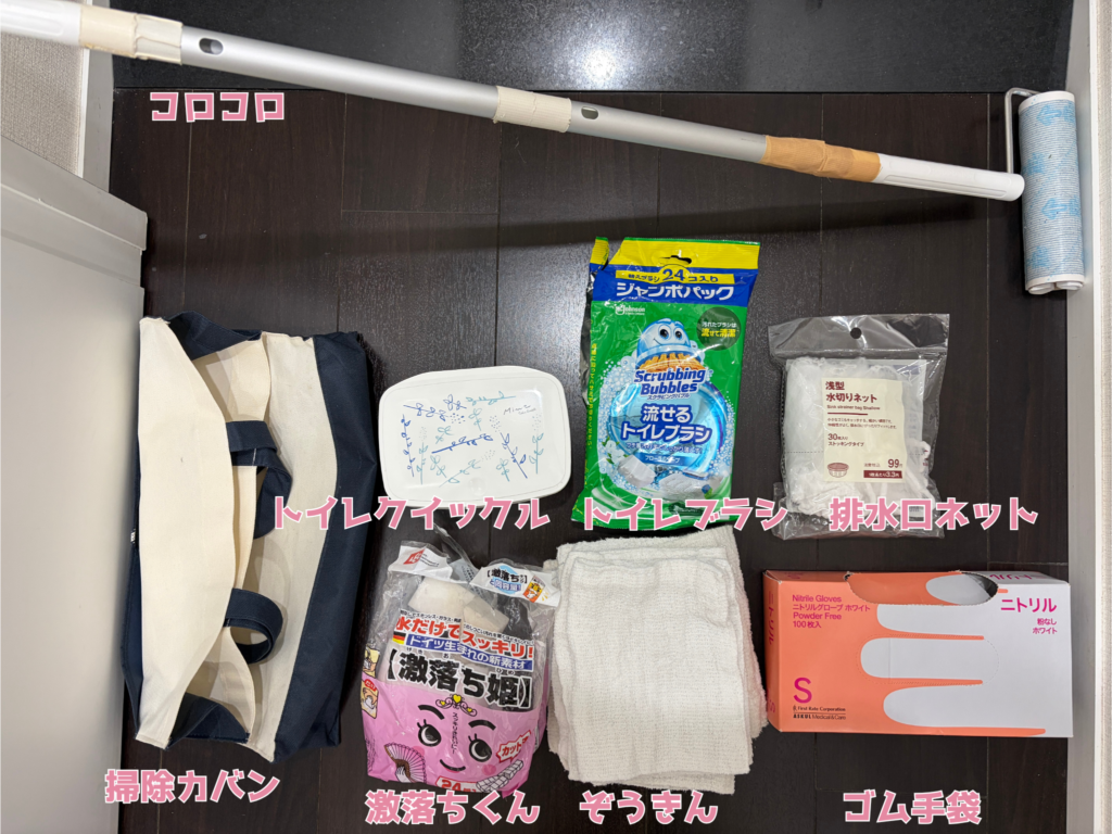 毎回準備するのがめんどうなので写真左下の掃除カバンに入れて、掃除代行の方が来られるときにカバンごと玄関に置き、使うようにしてもらっています。(お風呂の洗剤やトイレブラシ本体、食器洗い洗剤はそれぞれの場所に置いてあります)