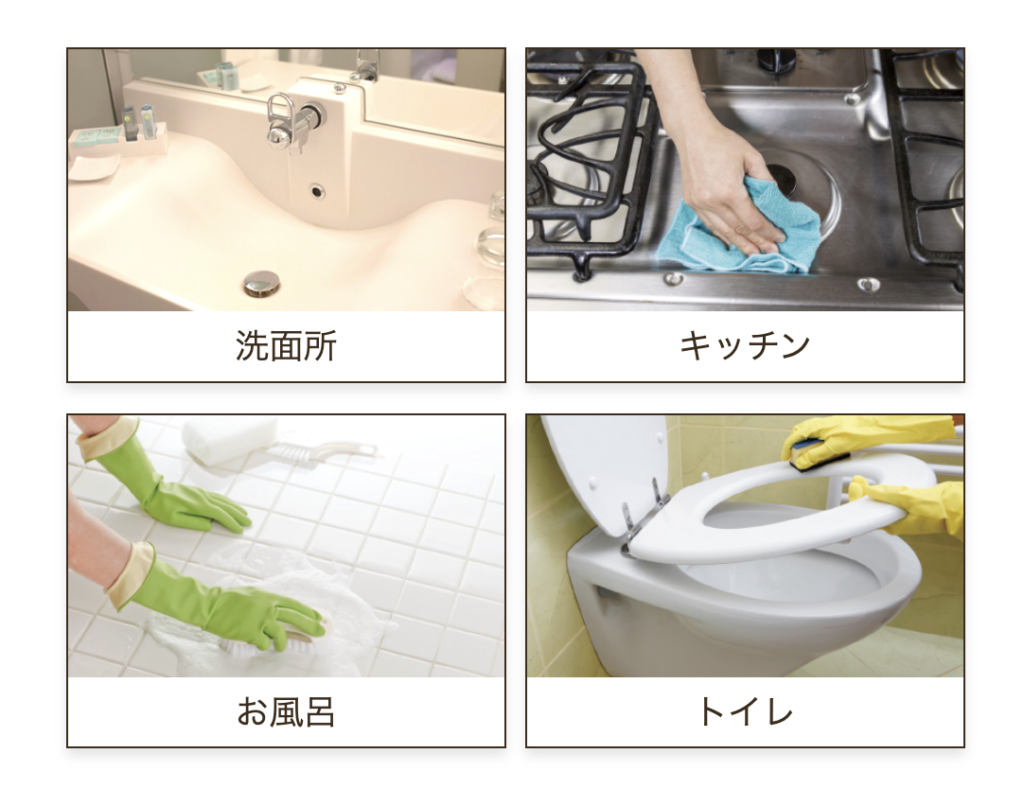 私は水回りの掃除を自分でしたくないので「お風呂、洗面台、トイレ、キッチン」の4カ所をお願いしています。